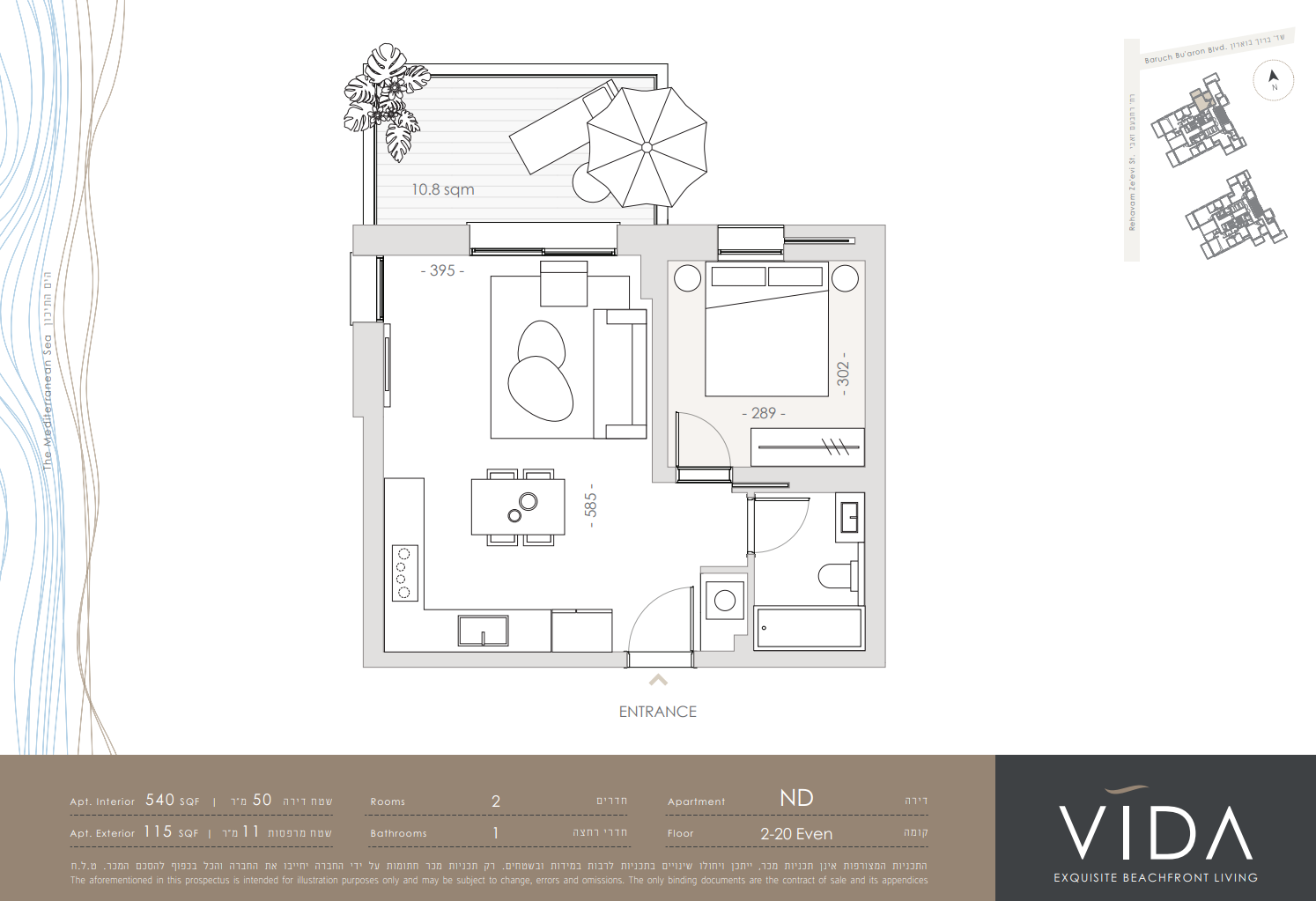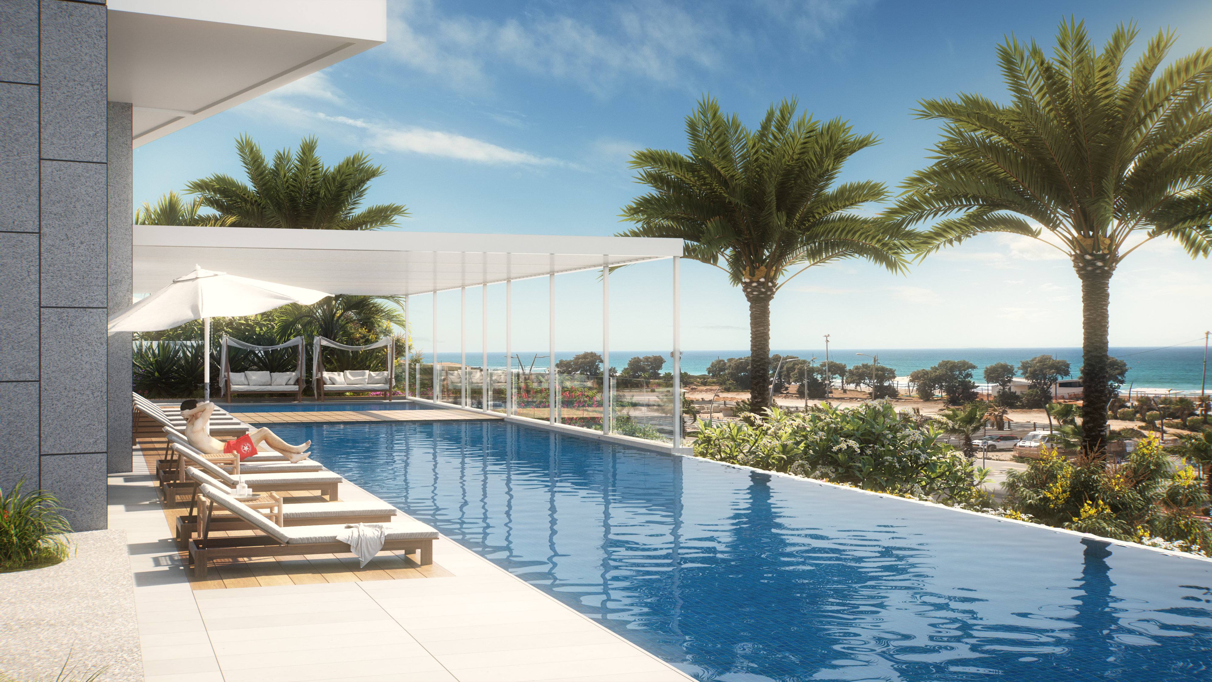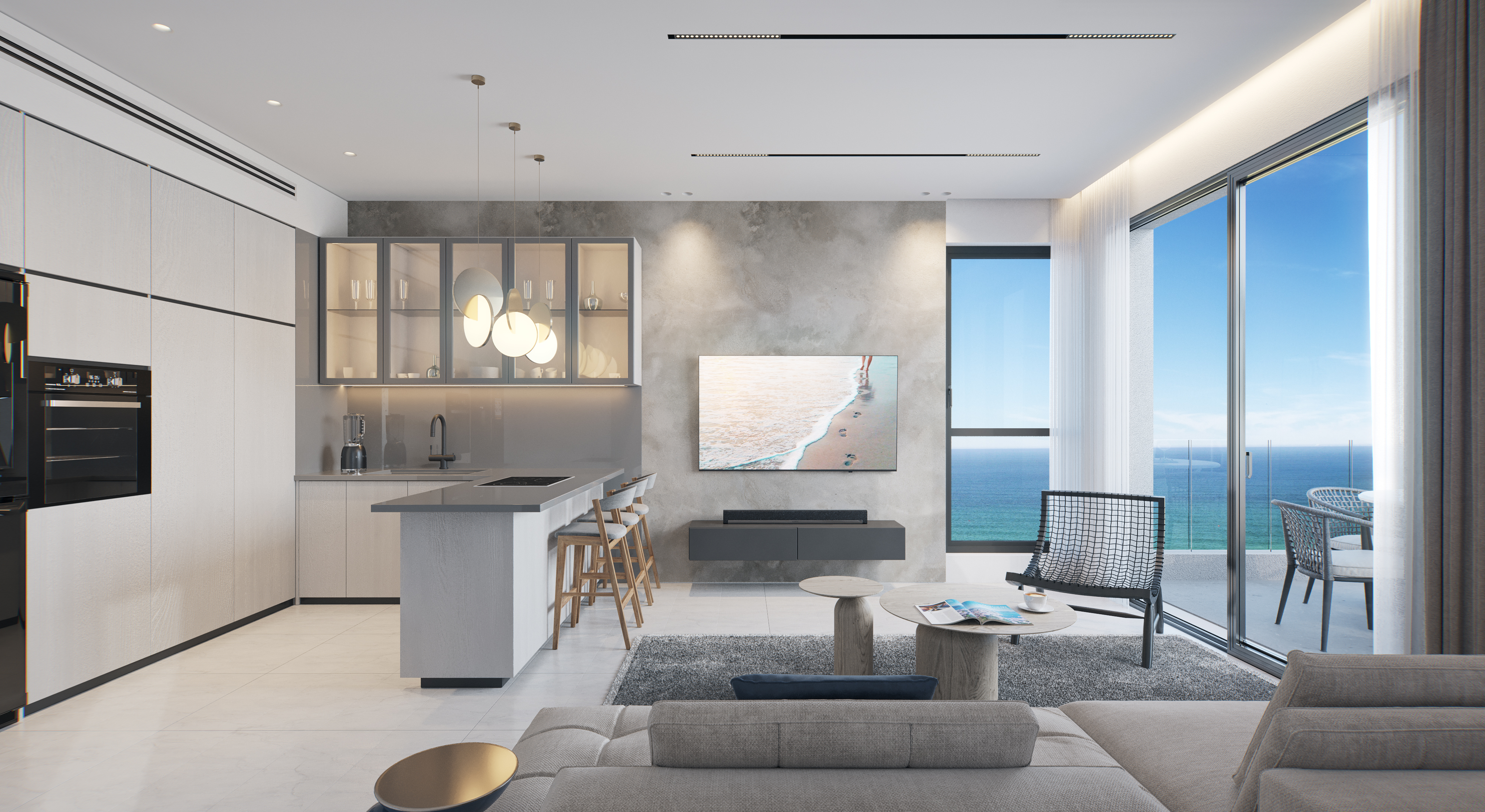 Apartment D feels like a luxury hotel suite with one bedroom. This carefully designed apartment offers all that you need in only 50 sqm. Stunning Western views of the Mediterranean from the side window in the living room are coupled with dramatic West and North or South views from the main living area and balcony.